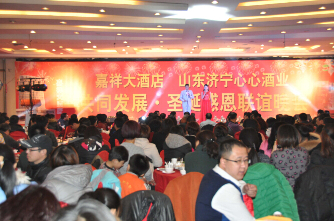 12月24日,平安夜,心心酒業(yè)與嘉祥大酒店聯(lián)合舉辦的“共同發(fā)展圣誕感恩聯(lián)誼會”在嘉祥大酒店隆重舉行。大酒店內(nèi)張燈結(jié)彩,火樹銀花,高朋滿座,喜氣洋洋,一派節(jié)日的氣氛。公司董事長韓宇、嘉祥大酒店總經(jīng)理楊總、嘉祥縣企事業(yè)單位、心酒經(jīng)銷商等近400余位嘉賓參加了聯(lián)誼會。
