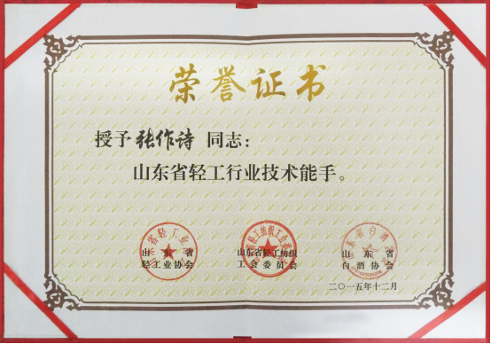 2015年12月18日-20日,山東省首屆“技能興魯”職業(yè)技能大賽暨山東省白酒首屆釀酒職業(yè)技能大賽隆重舉行。心心酒業(yè)有限公司糧食酒車間釀酒師張作詩參加比賽,被授予“山東省輕工行業(yè)技術能手”榮譽稱號。“這不是我個人榮譽,是企業(yè)榮譽,是各位領導對我的大力支持和企業(yè)對我的培養(yǎng)所取得的,所以,我要感謝廠領導給我這一個平臺。通過這次技能大賽所取得的經驗,要運用到生產實際中區(qū),要抓好質量關,要提高員工的思想素質,要提高員工的技能水平,團結上下一致,建立一個技能團隊,為企業(yè)發(fā)展,再創(chuàng)佳績。”張作詩說道。